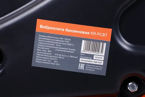 Виброплитой бензиновой Кратон KR-PC87 уплотняют грунт, асфальт и сыпучие материалы. Инструмент оснащен двигателем работающим от бензина. Удобность в использовании на площадках без электричества. Способен работать на протяжении до 4 часов и не нуждается в это время в дозаправке. Ручки и транспортировочные колеса складываются, что обеспечивает удобное хранение агрегата. Виброплита изготовлен из прочной стали. Оснащена баком для воды.